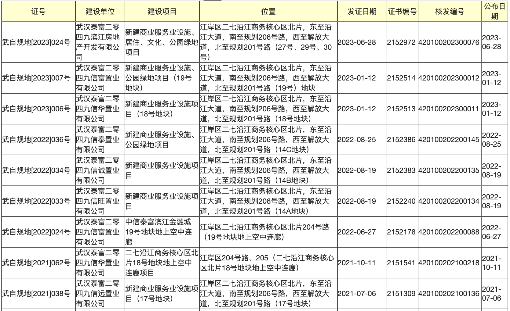 据乐居财经查阅,武汉泰富二零四九商业发展有限公司旗下有7家全资子公司,包括武汉泰富二零四九信旺置业、信远置业、滨江房地产开发、信富置业、信诚置业、信华置业和信泰置业有限公司,均为2017年4月7日,为武汉江岸区二七沿江商务核心区北片系列地块的项目公司。