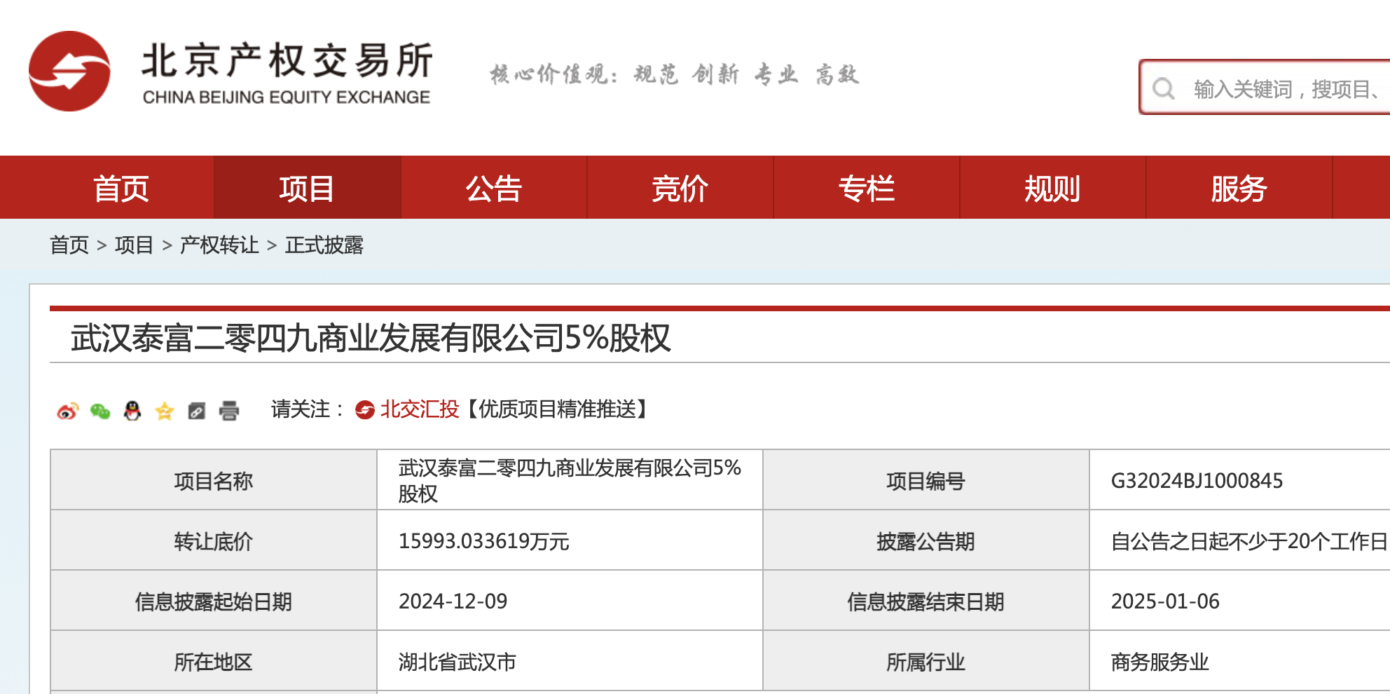乐居财经 徐迪 12月9日,武汉泰富二零四九商业发展有限公司5%股权在北京产权交易所挂牌,转让底价1.6亿元,转让方为中建三局基础设施建设投资有限公司。