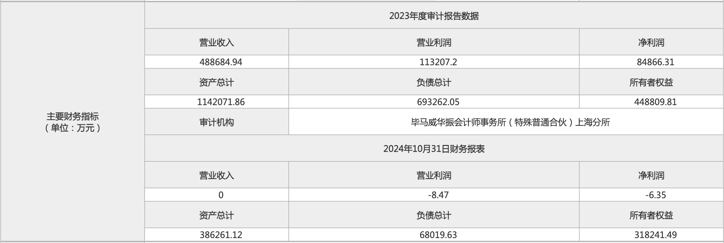 主要财务指标显示,标的企业2023年营收48.87亿元,净利润8.49亿元;2024年1-10月无营收,净利润为-6.15万元;截至2024年10月31日,公司资产总计38.63亿元,负债总计6.8亿元,所有都权益为31.82亿元。