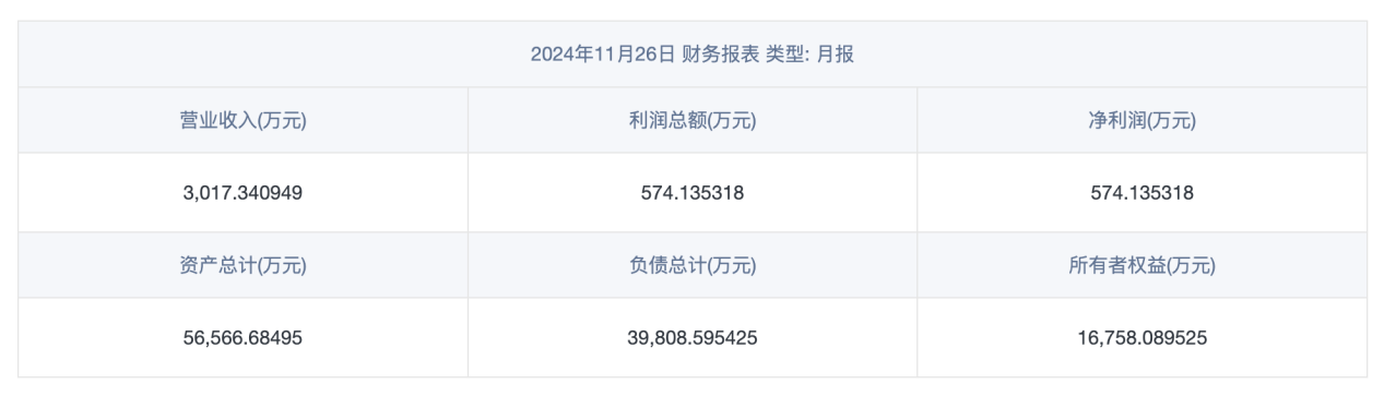 据2024年11月26日 财务报表显示,标的企业营业收入3017.34万元,净利润574.14万元,资产总计5.66亿元,负债总计3.98亿元。