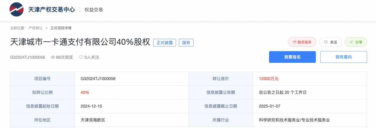 天津泰达集团挂牌转让城市一卡通支付40%股权,底价1.2亿元