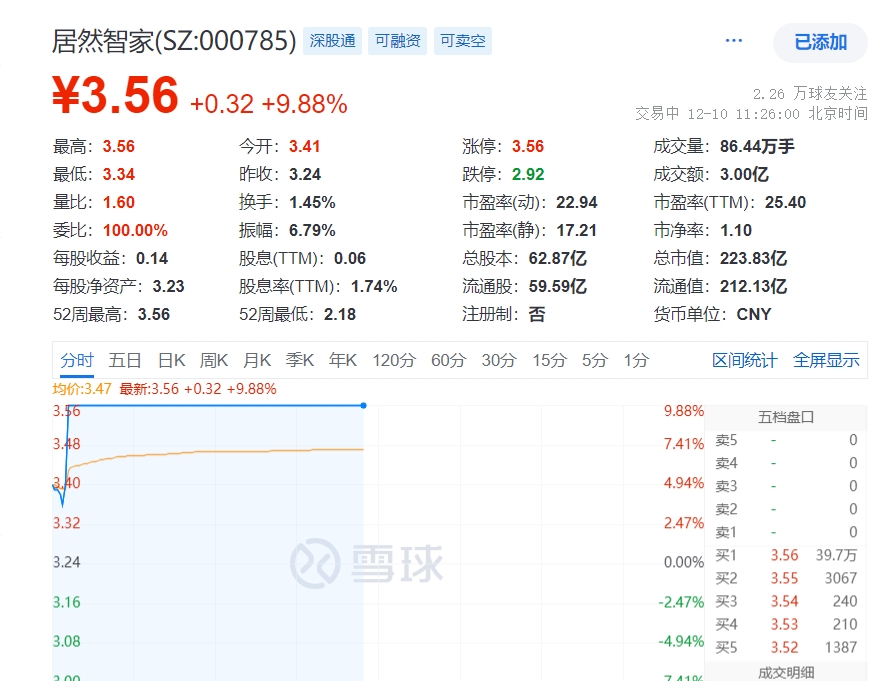 乐居财经 李兰 12月10日,截至11:26,居然智家(000785.SZ)股价涨9.88%,报3.56元/股,总市值为223.8亿元。
