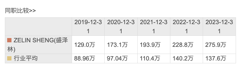 东方财富数据显示,2019年至2023年,盛泽林薪酬分别为129.0万元、173.1万元、193.9万元、228.8万元、275.9万元,连续四年涨薪。