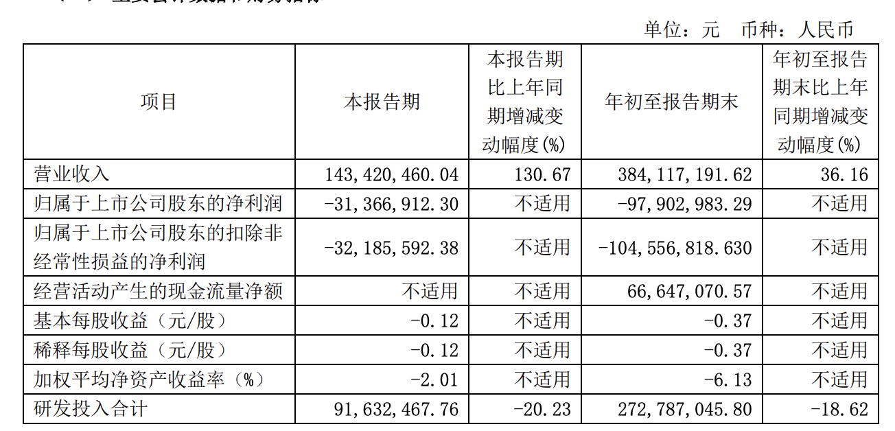 其中,第三季度营收为1.43亿元,同比增长130.67%;归属于上市公司股东的净利润为-3136.69万元。