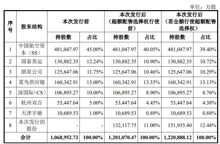 此外,多家物流集团也现身在国货航的股东名单前列,例如菜鸟持股13.35%,国泰货运持股10.90%,深国际持股8.9%,杭州双百持股4.45%。