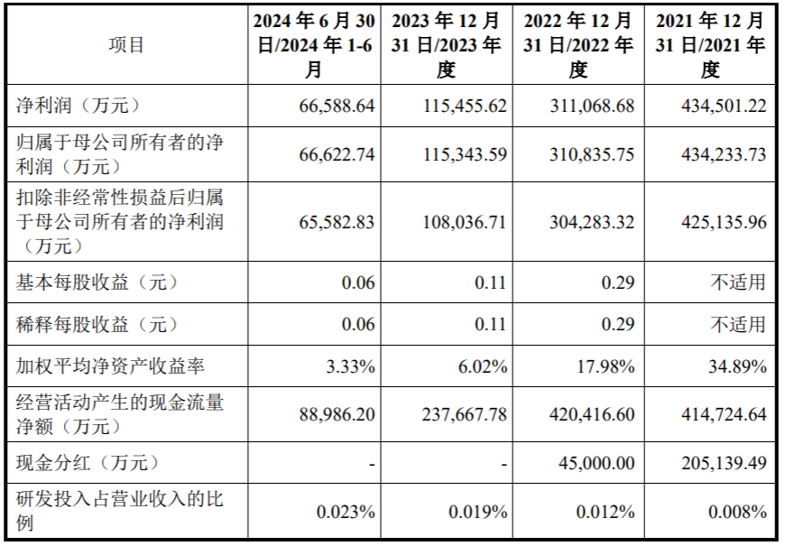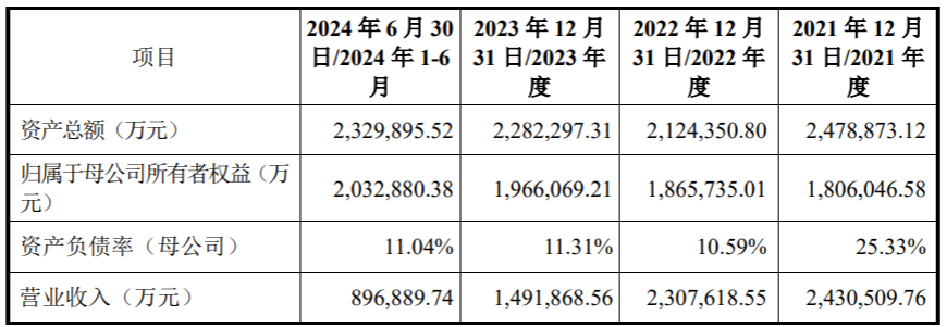 业绩方面,2021年至2023年及2024年上半年,公司分别实现营业收入243.05亿元、230.76亿元、149.19亿元和89.69亿元,分别实现净利润43.45亿元、31.11亿元、11.55亿元和6.66亿元。