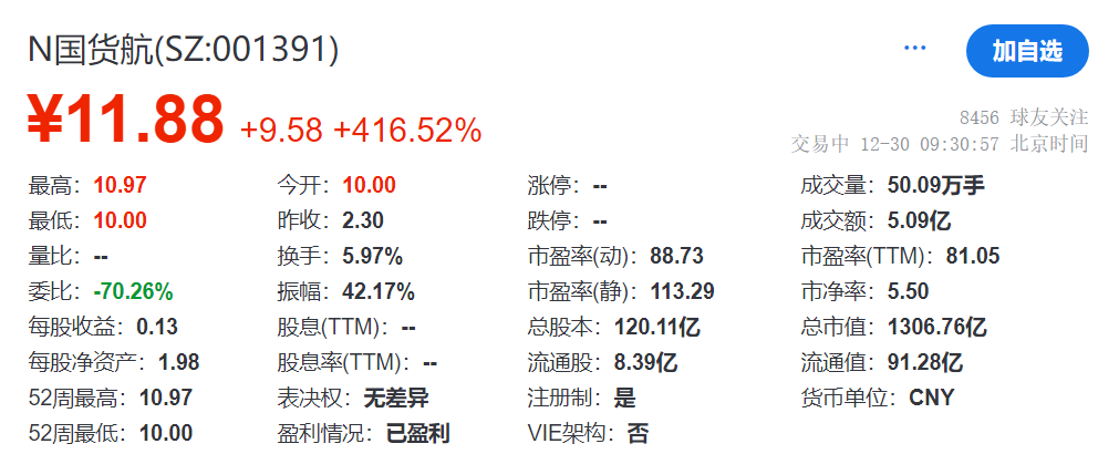 瑞财经 王敏 12月30日,N国货航(SZ:001391)登陆深交所,保荐机构为中信证券股份有限公司。其上市涨416.52%,总市值1306.76亿元。