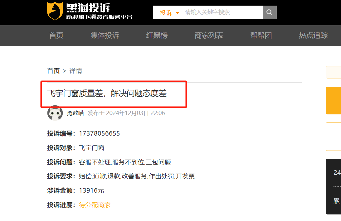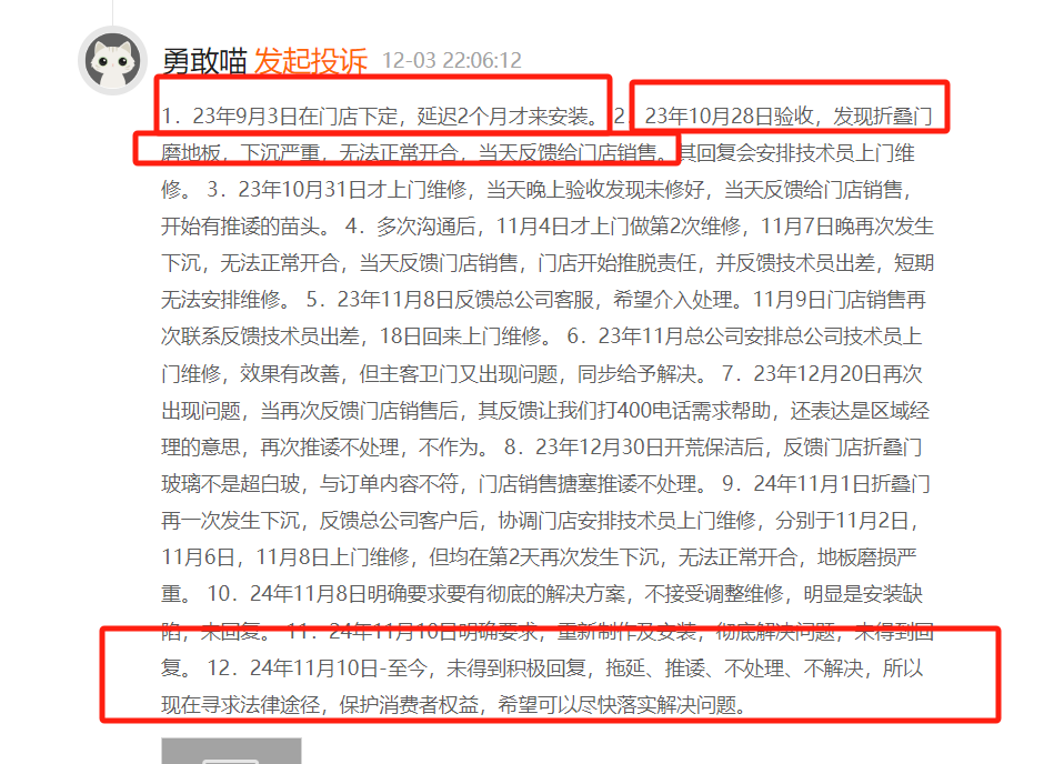 据黑猫投诉平台,有消费者投诉称,其于2023年9月3日在门店下定,延迟2个月才来安装,10月28日验收,发现折叠门磨地板,下沉严重,无法正常开合。后续该消费者多次反馈,截至该消费者投诉日,该问题未彻底解决。