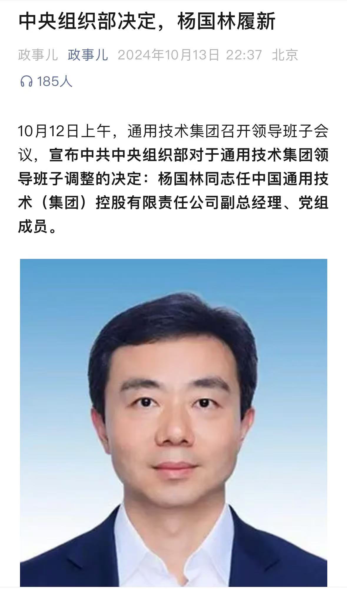 值得注意的是,三个月前,杨国林工作去向已确定。2024年10月,通用技术集团召开领导班子会议,宣布中共中央组织部对于通用技术集团领导班子调整的决定:杨国林同志任中国通用技术(集团)控股有限责任公司副总经理、党组成员。
