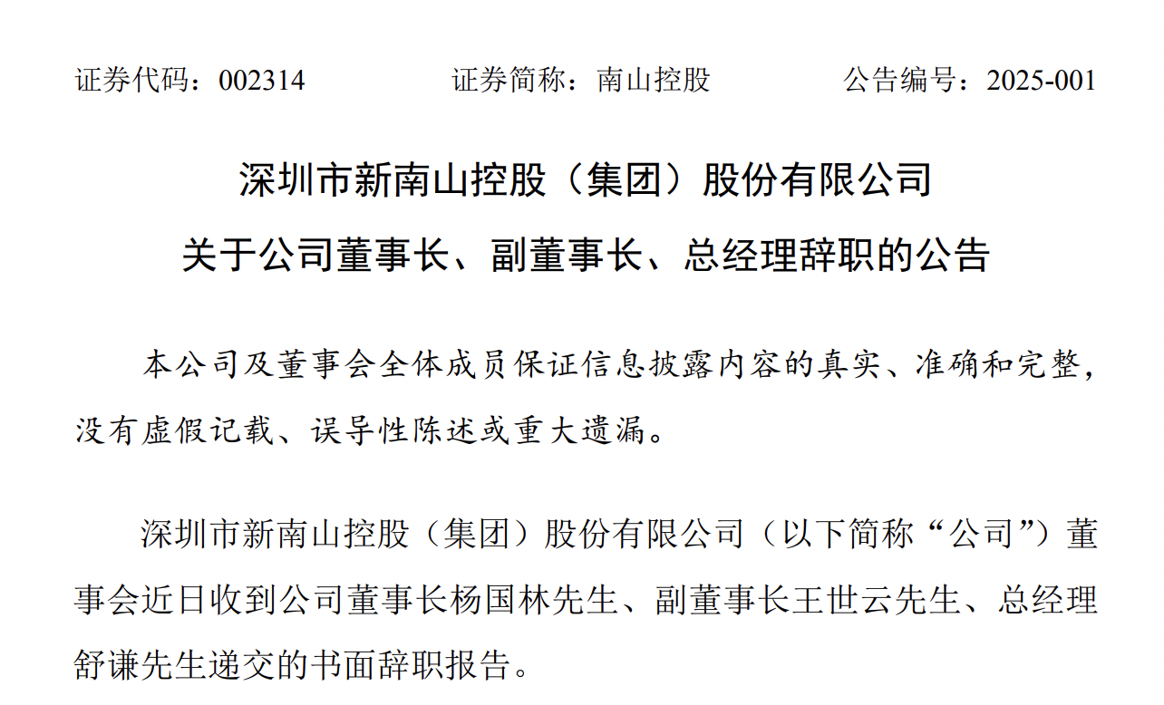 乐居财经 刘治颖 1月10日,南山控股(SZ002314)公告,公司董事会近日收到公司董事长杨国林、副董事长王世云、总经理舒谦递交的书面辞职报告。