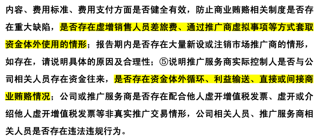百瑞吉迅速增长的销售费用也引起全国股转公司的注意,在其新三板挂牌首轮问询中,全国股转公司要求百瑞吉量化分析并披露公司销售费用规模较高的原因及合理性,是否存在虚增销售人员差旅费、通过推广商虚拟事项等方式套取资金体外使用的情形;又在二轮问询中追问结合销售人员的具体分工,说明销售人员数量的合理性,是否存在通过职工薪酬支出的商业贿赂或其他利益安排。