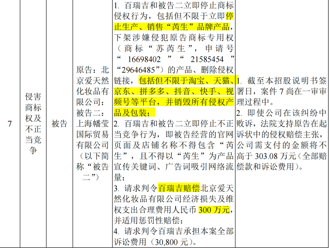 值得一提的是,百瑞吉历史上曾申请“芮生”标识作为商标,与北京爱天然化妆品有限公司就“芮生”标识存在纠纷,截至递表,该案尚在一审审理过程中。如果百瑞吉败诉,将面临不高于303.08万元的侵权赔偿。除了这一起作为被告的商标侵权案件,百瑞吉目前还存在商标相关的6起尚未了结的行政诉讼案件。