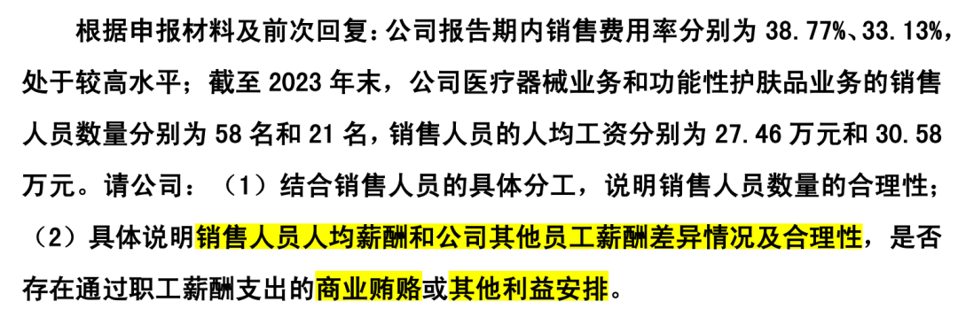 全国股转公司指出,百瑞吉在2022年和2023年的销售费用率分别为38.77%、33.13%,处于较高水平;截至2023年末,公司医疗器械业务和功能性护肤品业务的销售人员数量分别为58名和21名,销售人员的人均工资分别为27.46万元和30.58万元。