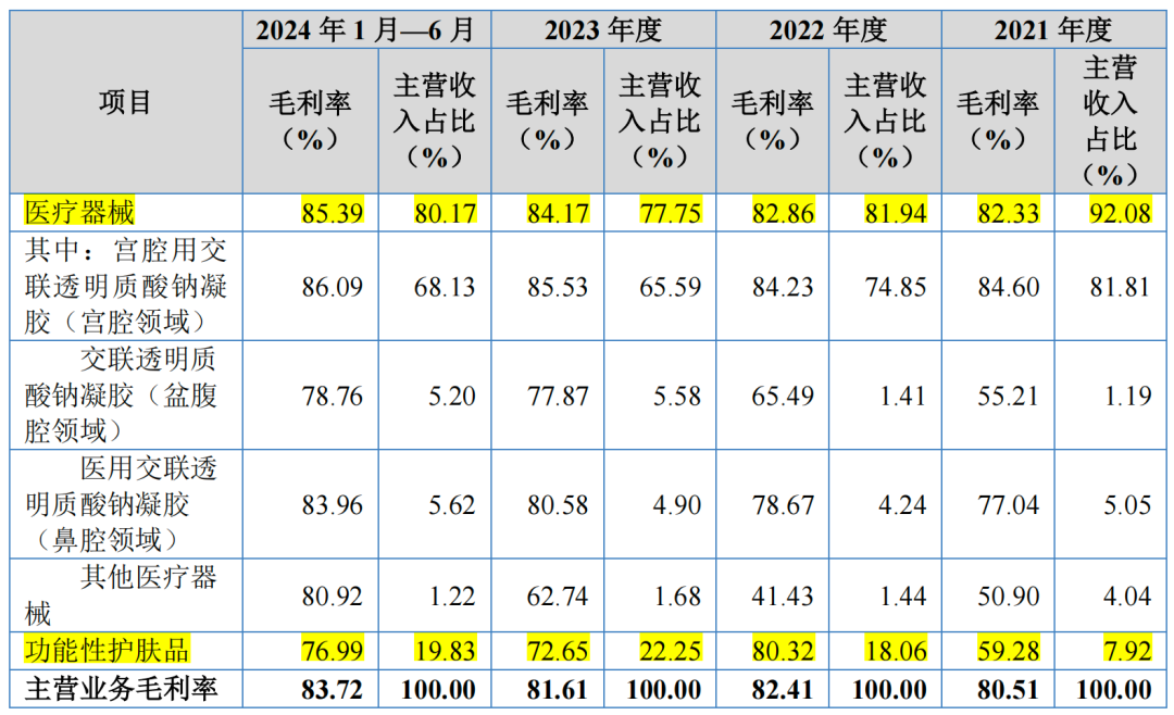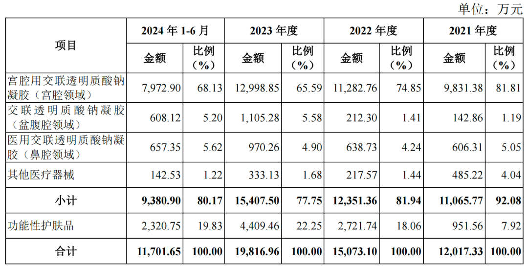 不过,百瑞吉的收入对单一产品存在明显依赖。分产品类别来看,报告期内,百瑞吉主营业务收入主要来源于医疗器械产品,其中宫腔用交联透明质酸钠凝胶(宫腔领域)产品收入分别为9831.38万元、1.13亿元、1.30亿元、7972.90万元,占同期主营业务收入的81.81%、74.85%、65.59%、68.13%,是报告期内公司最主要的产品。