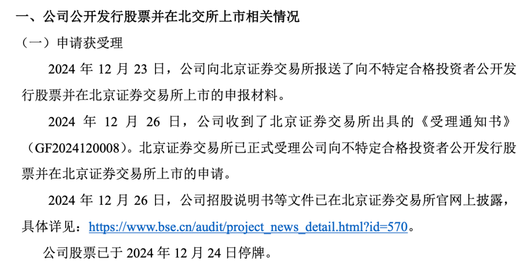 随后百瑞吉北交所IPO进程稳步推进,并在2024年12月23日,递交了北交所上市申报材料,24日股票停牌,26日北交所受理其申请。