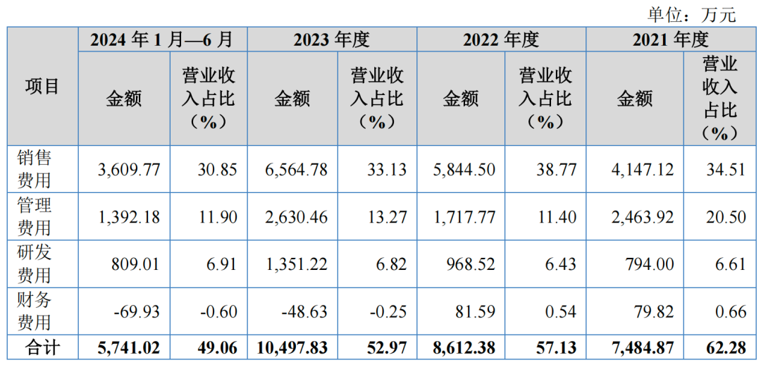 报告期内,百瑞吉期间费用总额分别为7484.87万元、8612.38万元、1.05亿元、5,741.02万元,期间费用率分别为62.28%、57.13%、52.97%、49.06%。随着收入增长,规模效应凸显,期间费用率整体呈逐渐下降的趋势。