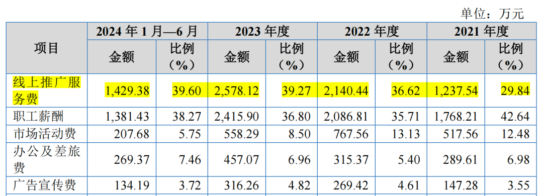为此,百瑞吉也投入了一定规模的销售费用。从2021年为维缇芮生铺设线上营销渠道开始,百瑞吉的线上推广服务费从1237万元迅速增长到仅2024上半年就花费1429万元。