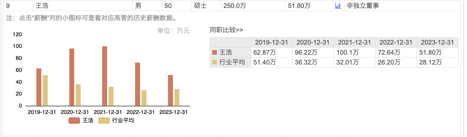 薪酬方面,2019年至2023年,王浩从中化岩土获得的薪酬分别为62.87万元、96.22万元、100.1万元、72.64万元、51.80万元。