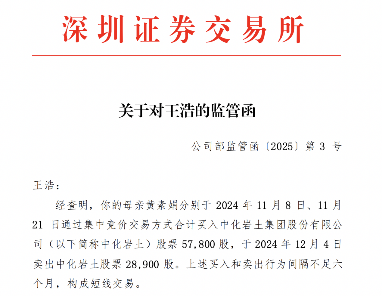 经查明,王浩的母亲黄素娟分别于2024年11月8日、11月21日通过集中竞价交易方式合计买入中化岩土集团股份有限公司(以下简称:中化岩土)股票5.78万股,于2024年12月4日卖出中化岩土股票2.89万股。上述买入和卖出行为间隔不足六个月,构成短线交易。