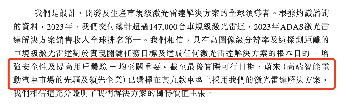 图达通是设计、开发及生产车规级激光雷达解决方案的企业。根据灼识谘询的资料,2023年,其交付总计超过147,000台车规级激光雷达,2023年ADAS激光雷达解决方案销售收入全球排名第一。截至最后实际可行日期,蔚来已选择在其九款车型上采用图达通的激光雷达解决方案。