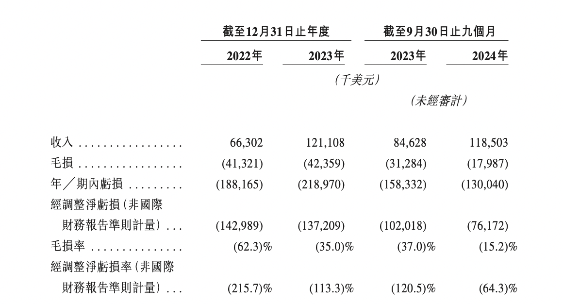 据招股书,2022年-2023年及2024年前三季度,图达通实现收入分别为6630.2万美元、1.21亿美元、1.18亿美元;期内亏损分别为1.88亿美元(约合人民币13.71亿元)、2.19亿美元(约合人民币15.97亿元)、1.3亿美元(约合人民币9.48亿元)。不过,2024年前三季度亏损同比收窄17.72%。