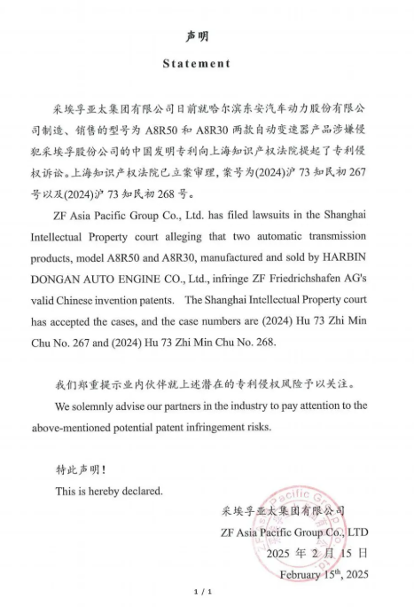声明表示,采埃孚亚太集团有限公司日前就哈尔滨东安汽车动力股份有限公司制造、销售的型号为A8R50和A8R30两款自动变速器产品涉嫌侵犯采埃孚股份公司的中国发明专利向上海知识产权法院提起了专利侵权诉讼。