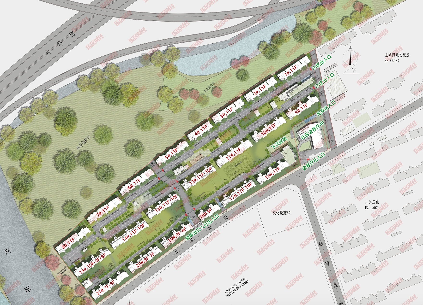 0002地块拟建设21栋7-11层住宅楼,最高建筑32.6米,由南至北三排式整齐排列,北部一排1-7#栋楼均为11层洋房;