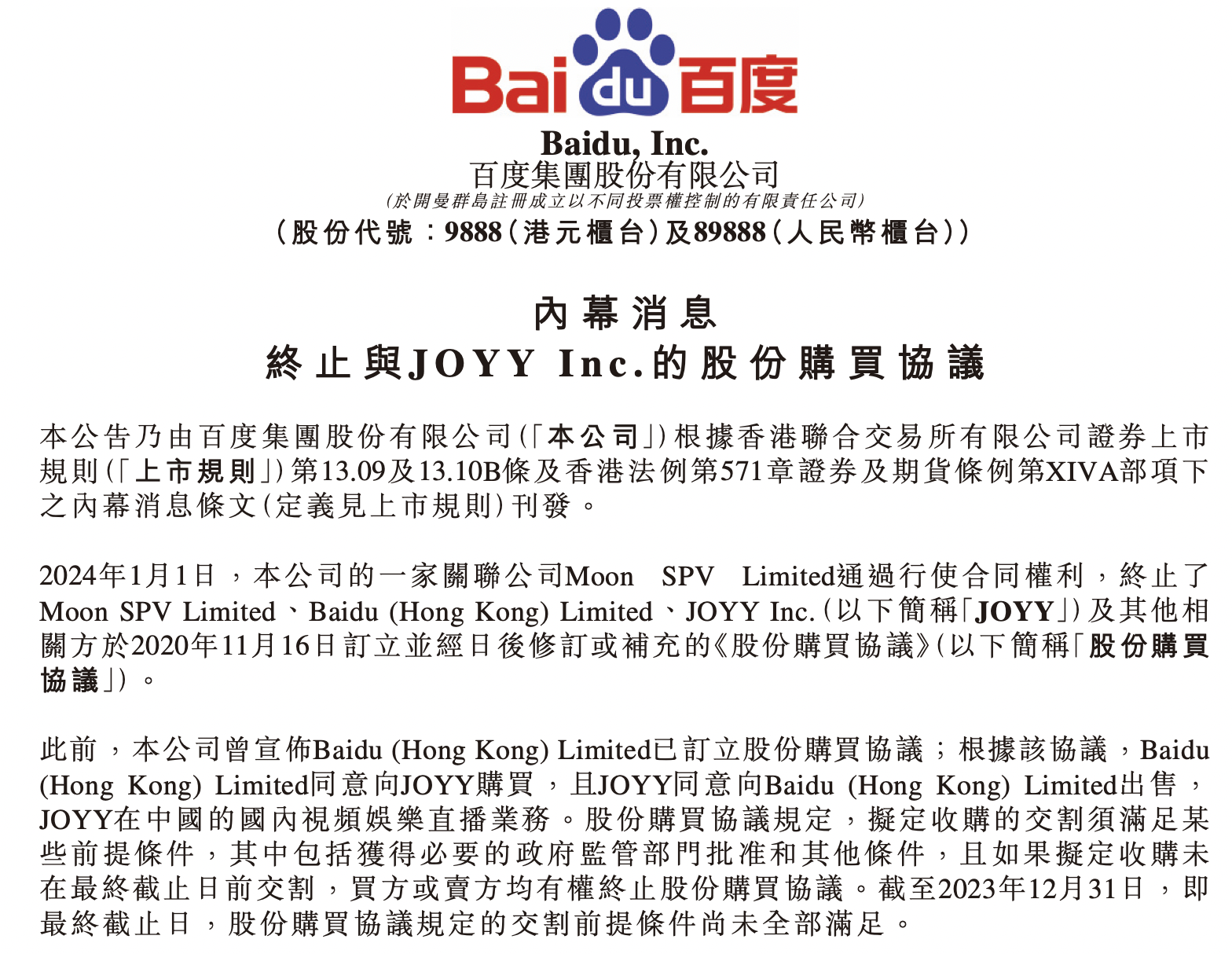 2024年1月1日,百度公告称,关联方Moon按照此前签署的协议,终止对YY直播的股权收购协议。理由是截至2023年12月31日,即最终截止日,股份购买协议规定的交割前提条件尚未全部满足。