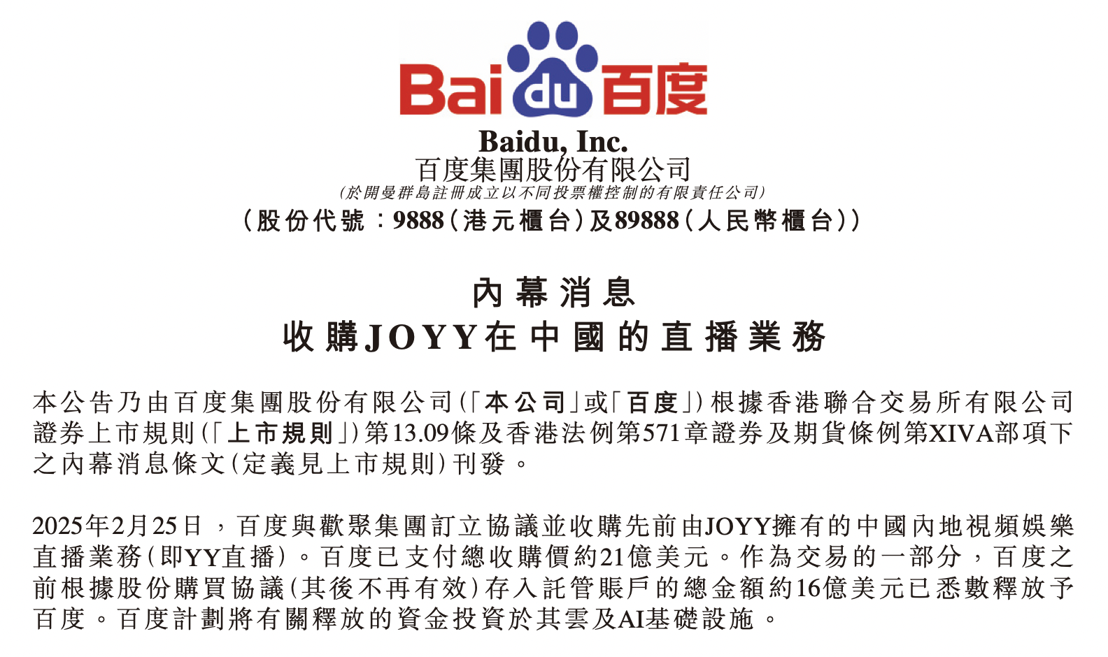 2月25日,百度在港交所发布公告称,其与欢聚集团订立协议并收购先前由JOYY拥有的中国内地视频娱乐直播业务(即YY直播)。百度已支付总收购价约21亿美元(约合人民币152亿元)。