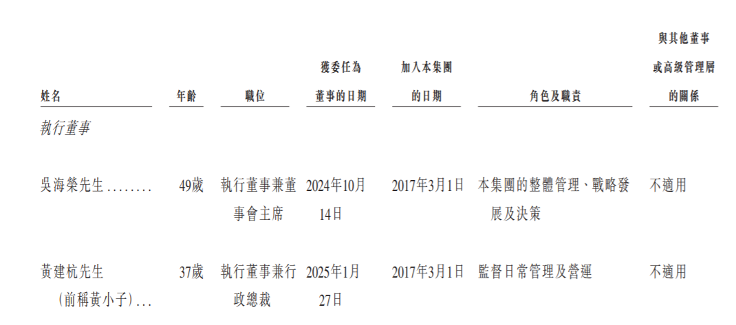 吴海荣为公司执行董事兼董事会主席,黄建杭为公司执行董事兼行政总裁。