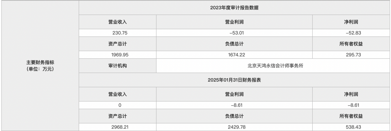 据2023年度审计报告数据显示,标的企业营业收入230.75万元,净利润-52.83万元,资产总计1969.95万元,负债总计1674.22万元。