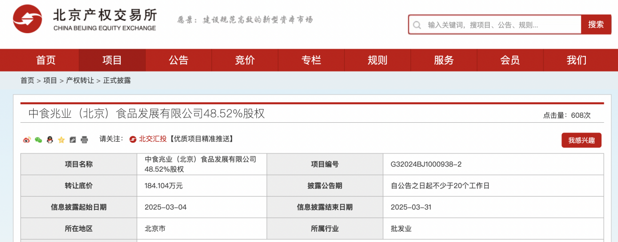 瑞财经 刘治颖 3月4日,中国食品工业(集团)有限公司、食品行业生产力促进中心共挂牌转让中食兆业(北京)食品发展有限公司48.52%股权,披露结束日期为2025-03-31。