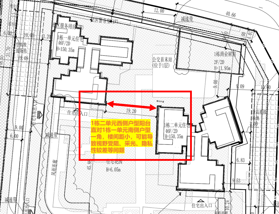 如1栋一单元与1栋二单元,都是46层的超高层,楼间距仅19米左右。意味这两栋的部分户型视线可能会受阻,有压抑感。
