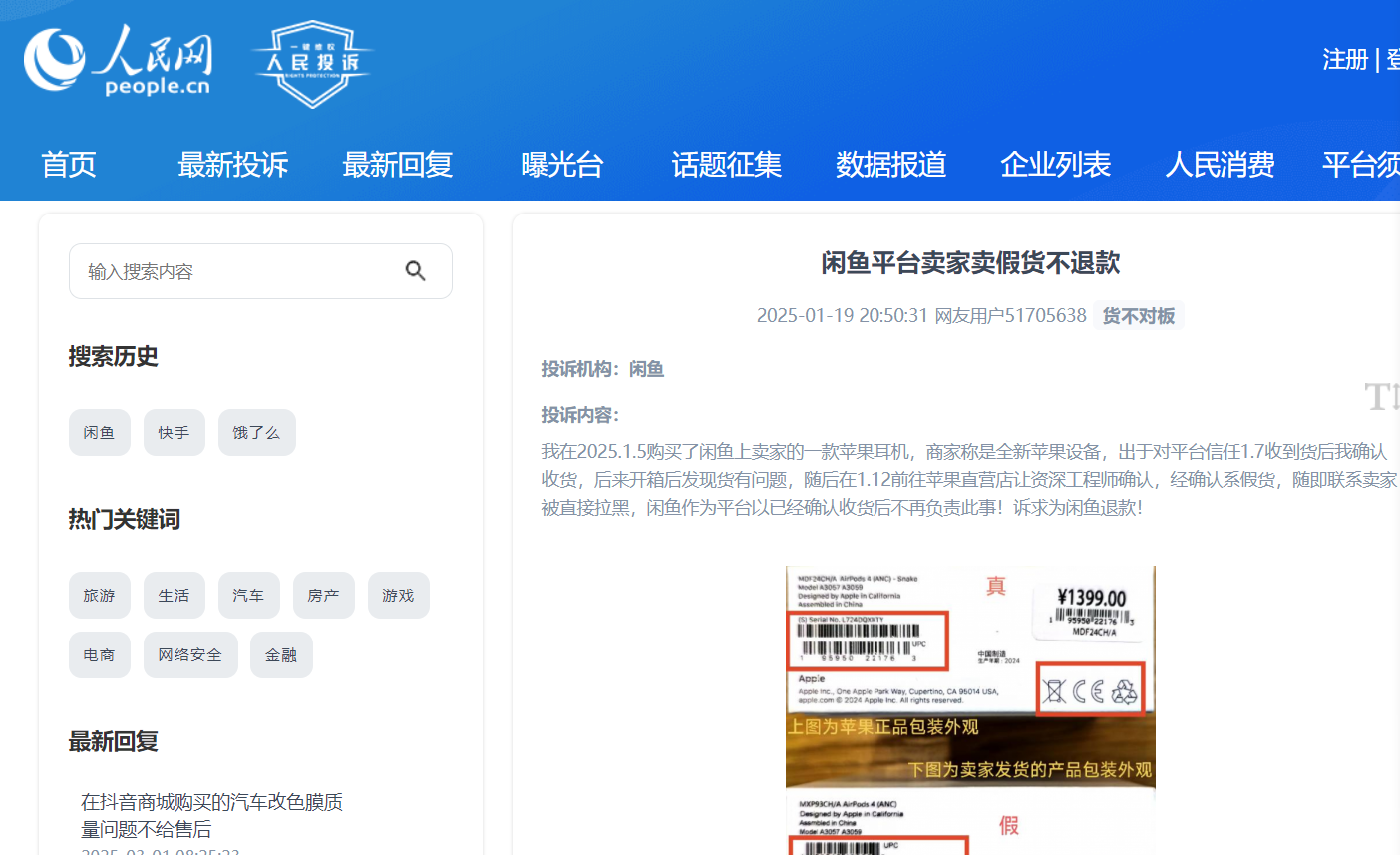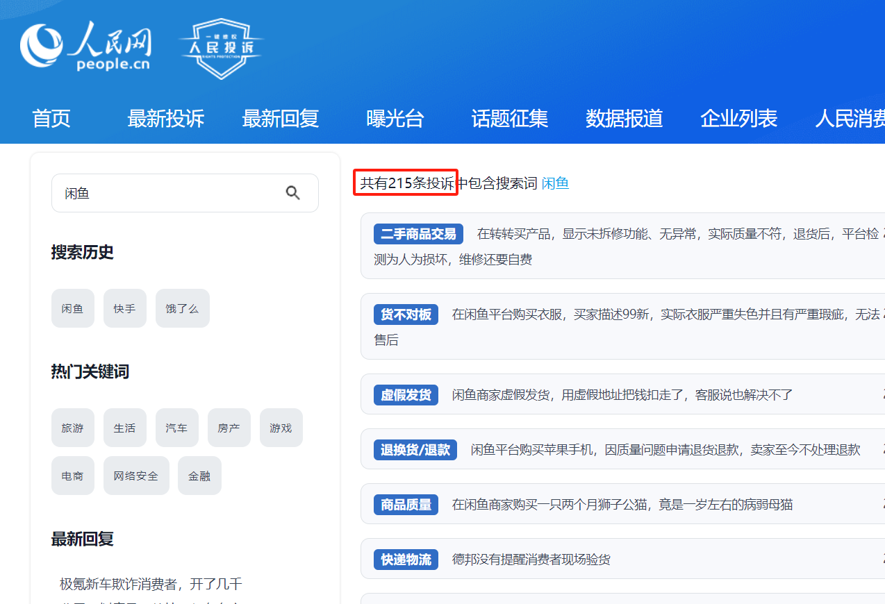乐居财经 严明会 据人民网投诉平台,截至2025年3月12日11点,在人民网搜索“闲鱼”相关投诉达215条,货不对板、拒绝退款等现象成为投诉关键词。