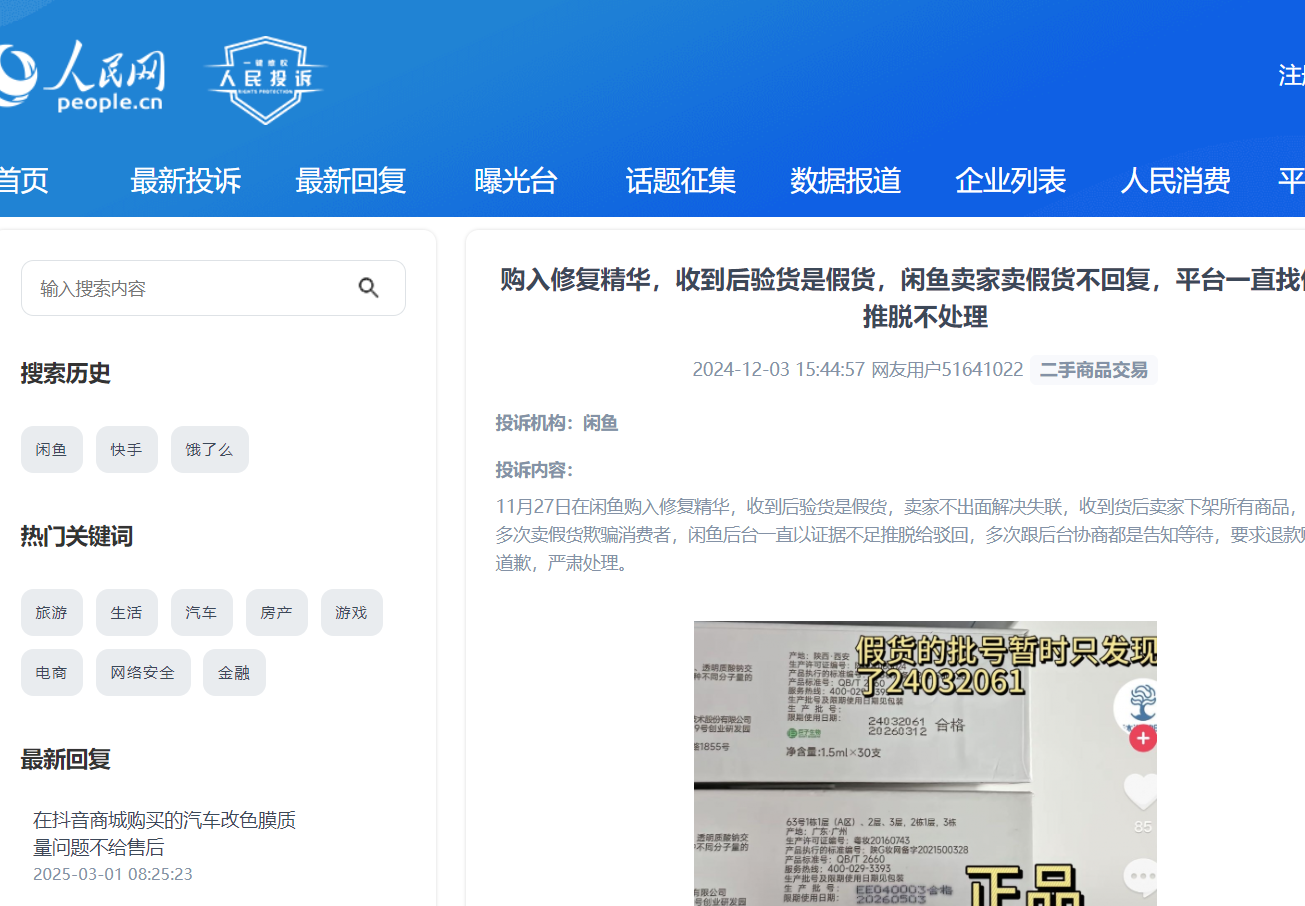 反馈售后难处理的,还有网友用户51641022。其称2024年11月27日在闲鱼购入修复精华,收到后验货是假货,卖家不出面解决失联,收到货后卖家下架所有商品。多次跟闲鱼后台协商都是告知等待,要求退款赔偿并道歉,严肃处理。