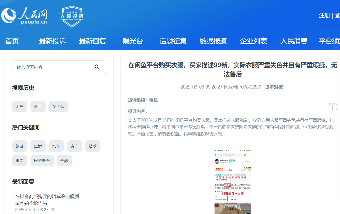 有网友于2025年3月3日投诉称,是2025年2月13日在闲鱼平台购买衣服,买家描述衣服99新,收到以后衣服严重失色并且有严重瑕疵,将该买家拉黑拒绝处理,买家与闲鱼平台多次联系,无法售后。因此申请维权退货退款。
