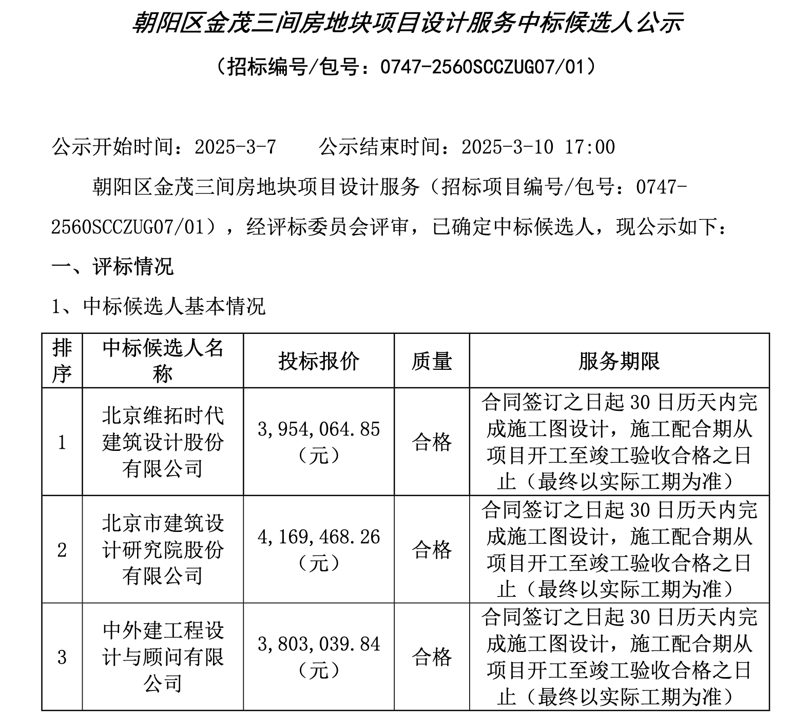 3月7日,朝阳区金茂三间房地块项目设计服务中标候选人公示。分别为: