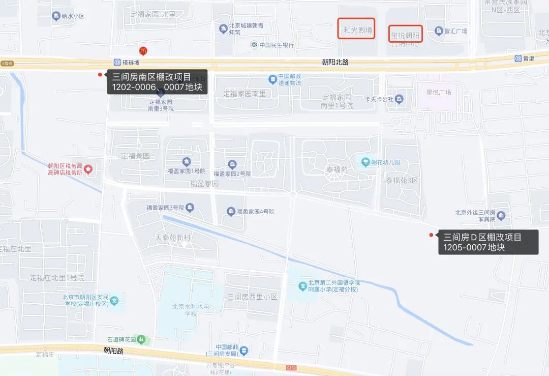 两块地相距1公里左右,同在地铁6号线沿线,其中D区地块靠近黄渠站,距离朝阳路更近一些;南区地块则紧邻朝阳北路,褡裢坡站。