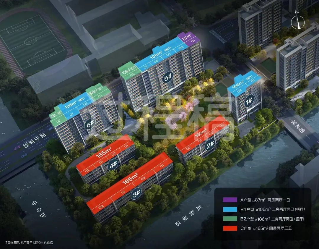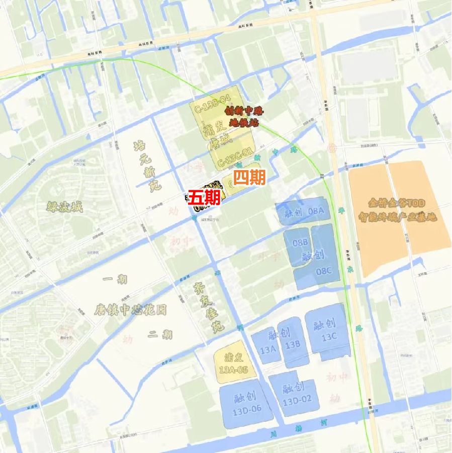 二期唐颐名邸处于创新中路和华夏高架路中间,位置上更孤立一些,离地铁站也比较远,与另外三期项目之间隔着配套小学和幼儿园,周边教育资源丰富,商业配套则基本聚集在创新中路以北。
