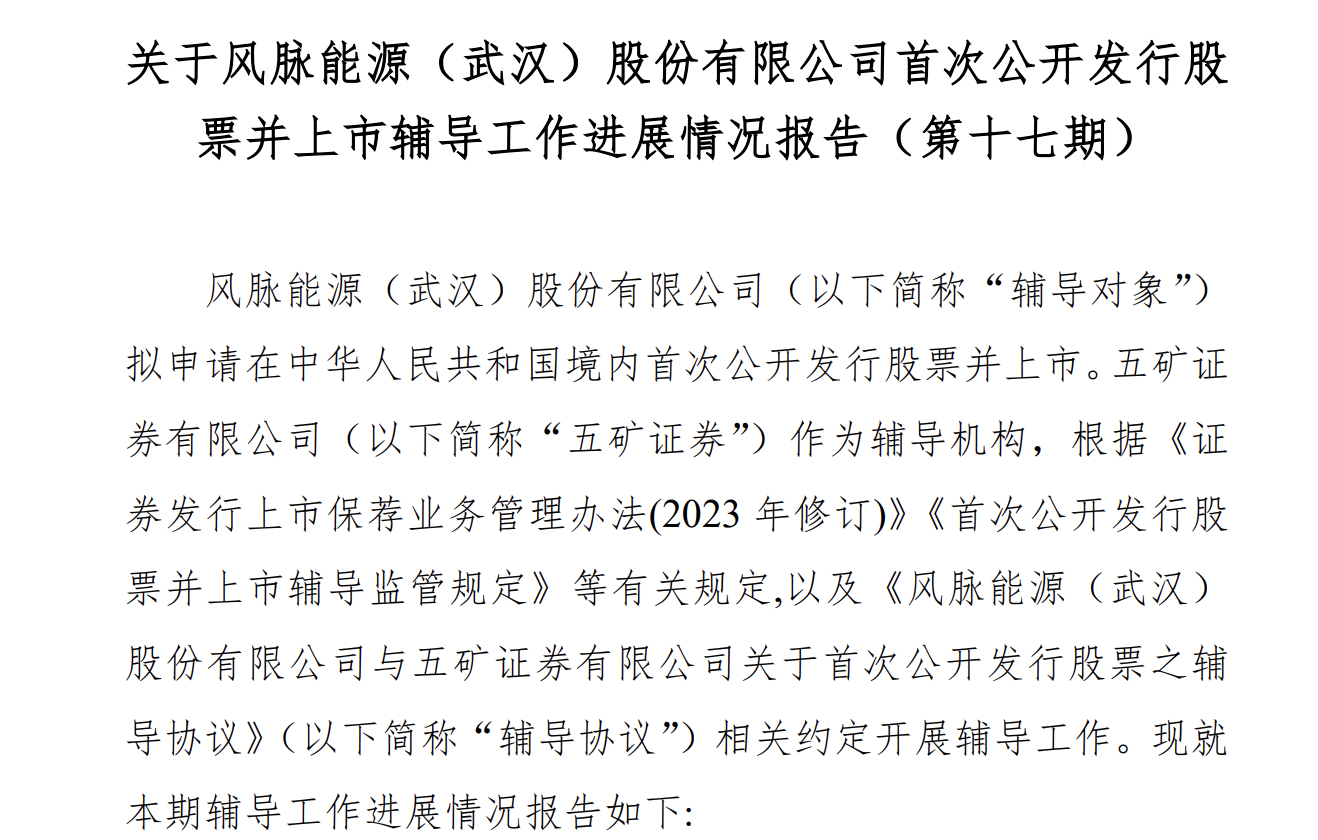 乐居财经 刘治颖 近日,风脉能源(武汉)股份有限公司(以下简称:风脉能源)发布关于首次公开发行股票并上市辅导工作进展情况报告(第十七期),参与公司辅导工作的机构为五矿证券有限公司、德勤华永会计师事务所(特殊普通合伙)和北京大成(武汉)律师事务所。