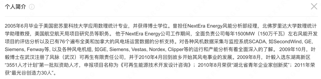资料显示,叶毅,2005年6月毕业于美国密苏里科技大学应用数理统计专业,并获得博士学位。曾担任NextEra Energy风能分析部经理,北佛罗里达大学数理统计学助理教授,美国航空航天局项目研究员等职务。 他于NextEra Energy公司工作期间,全面负责公司每年1500MW(150万千瓦)左右风能开发项目的评估分析以及已有76个遍布全美和加拿大的风电场运营数据的分析支持。对各种风机数据采集与监控系统SCADA, 如SecondWind, GE, Siemens, Fenway等, 以及各种风电机组, 如GE, Siemens, Vestas, Nordex, Clipper等的运行和产能分析有着全面深入的了解。