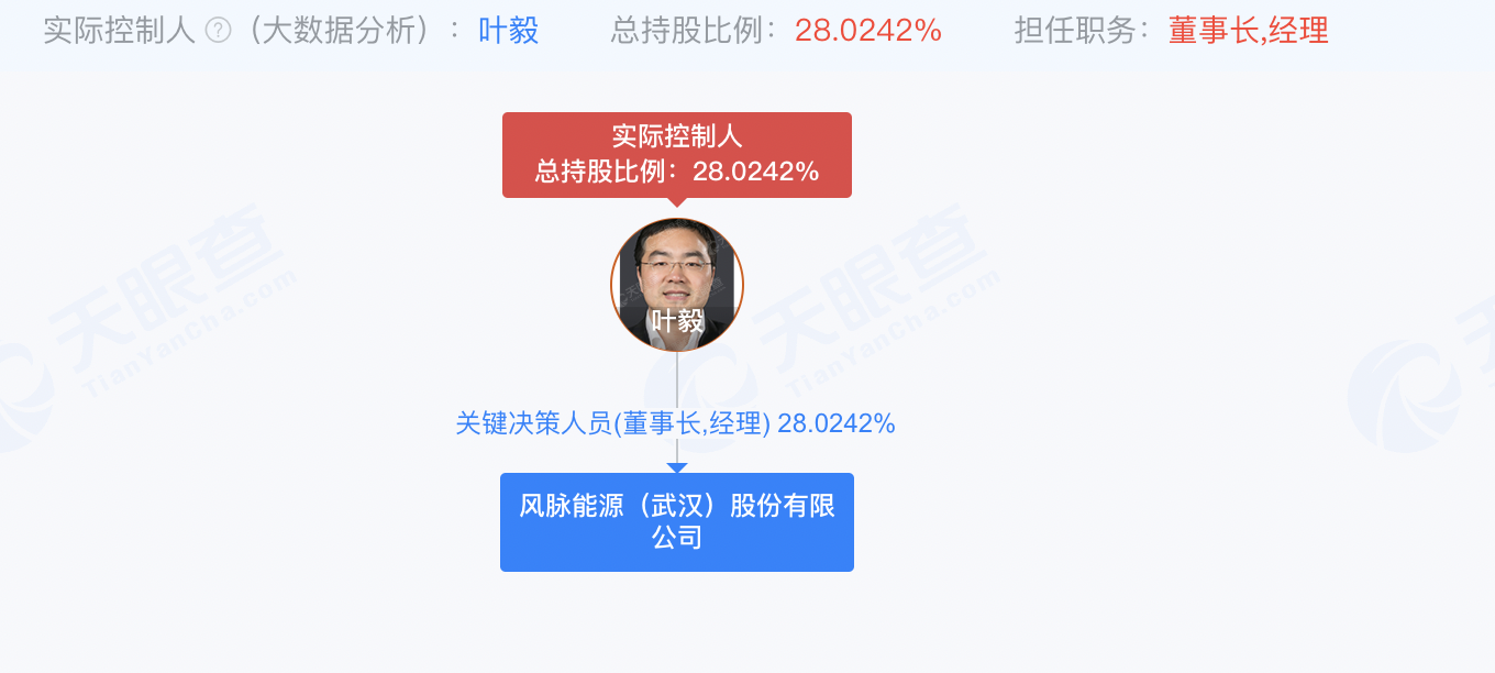 天眼查显示,风脉能源法定代表人为叶毅,注册资本为4325.89万元,实际控制人为叶毅,总持股比例为28.02%。目前,叶毅担任董事长、经理。