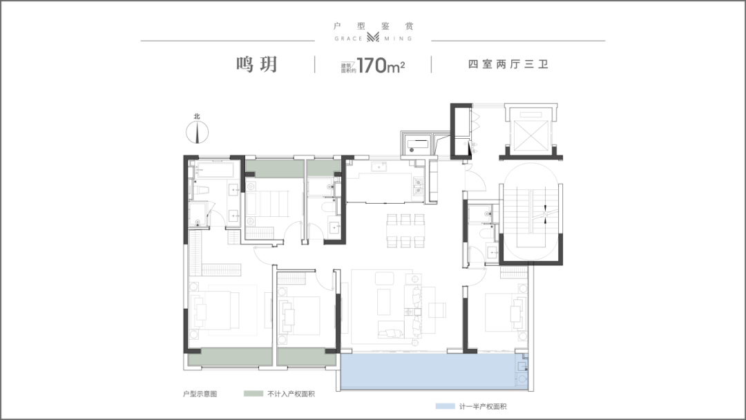 以建面约170㎡户型为例,四室两厅三卫,4.5开间朝南设计,奢享约16.3m南向大面宽,超长景观面与开窗面,尽享阳光沐浴。跑道级双联阳台宽约9.1m,采光面充沛,空间通透明亮。
