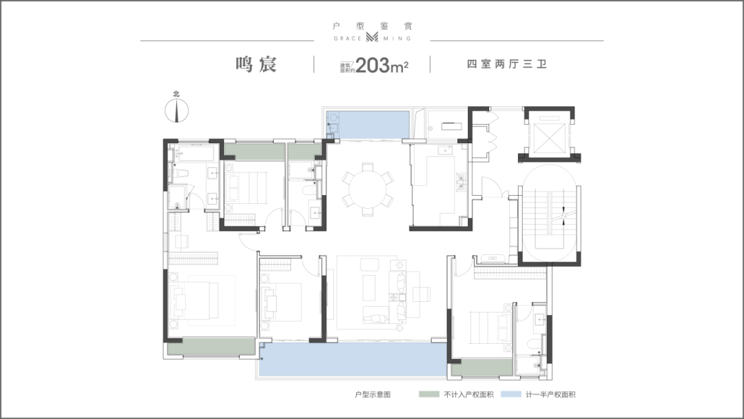 此外,建面约203㎡四室两厅三卫户型,将改善浓稠度拉到了更高。5开间朝南的设计,南向约18.4米面宽,搭配南北双阳台且南阳台开间约9.2米,在室内呈现出奢侈的全明光厅;南向双套房,豪华套房般的主卧,每个细节都满足改善客群的生活理念追求。
