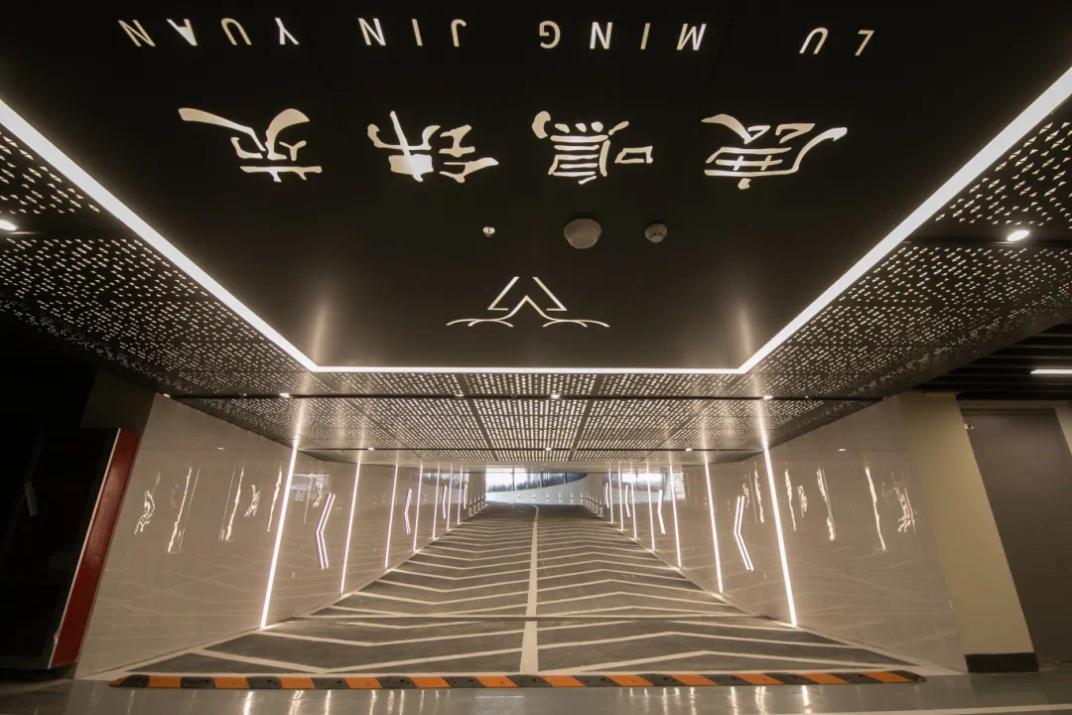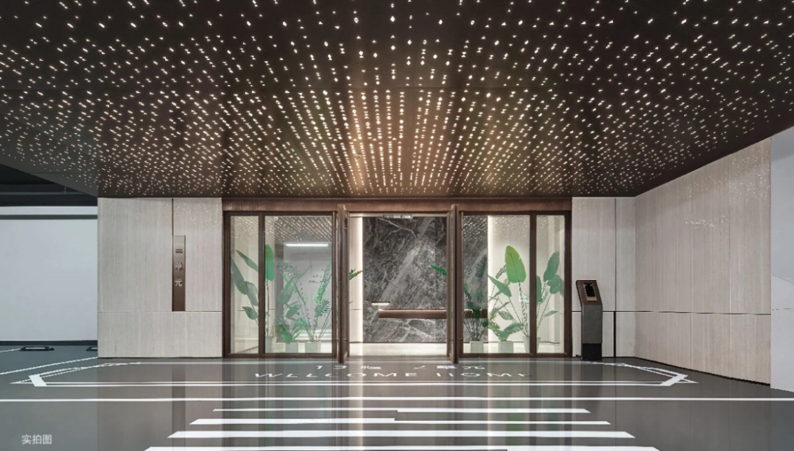 地库入户大堂同样质感拉满。大面岩板与大尺寸仿石材料巧妙搭配,提升整体空间材料质感;华丽的星空顶车马厅,金咖色铝板配合星光灯,在灯光映射下让日常的归家变成了一场穿越星际的奇妙旅行。