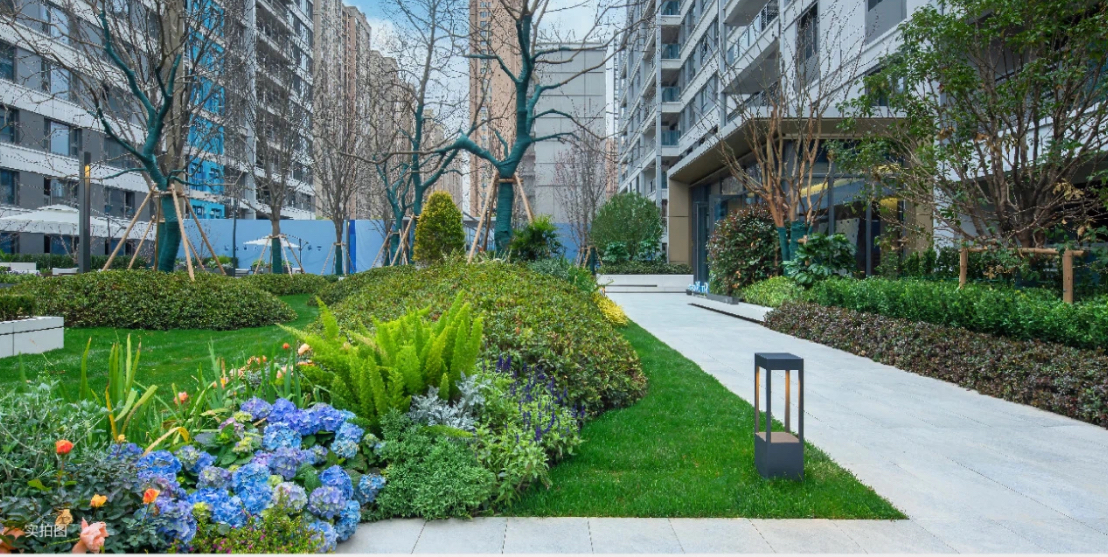 狐尾天门冬、大吴风草、迷迭香、芙蓉菊、绣球花等20余种观赏花卉组团配置、点缀其中,形成高低错落的景观体验,营造四季皆有景的生活意境。行走于此间,树之形、花之姿、叶之韵,共生一步一景的自然之美,仿佛置身于青绿的江山画卷。