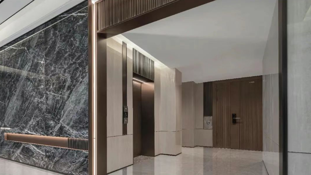 作为归家动线的延伸,电梯厅延续了大堂优雅大气的设计风格,高级感满满。双开门电梯的设计营造出专属的归家空间,每一次乘梯都仿佛开启一段尊贵的旅程,出入之间尽显从容。
