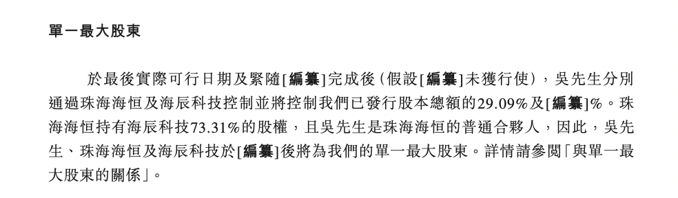 IPO前,吴祖钰分别通过珠海海恒及海辰科技控制并将控制公司已发行股本总额的29.09%。珠海海恒持有海辰科技73.31%的股权,且吴祖钰是珠海海恒的普通合伙人,因此,吴祖钰、珠海海恒及海辰科技将为其单一最大股东。