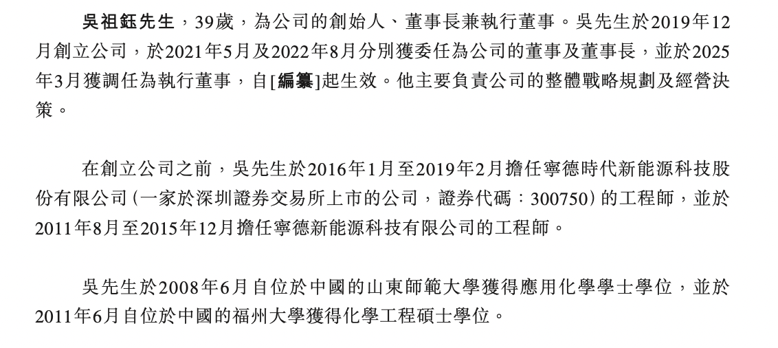 在创立公司之前,吴祖钰于2016年1月至2019年2月担任宁德时代新能源科技股份有限公司的工程师,并于 2011年8月至2015年12月担任宁德新能源科技有限公司的工程师。