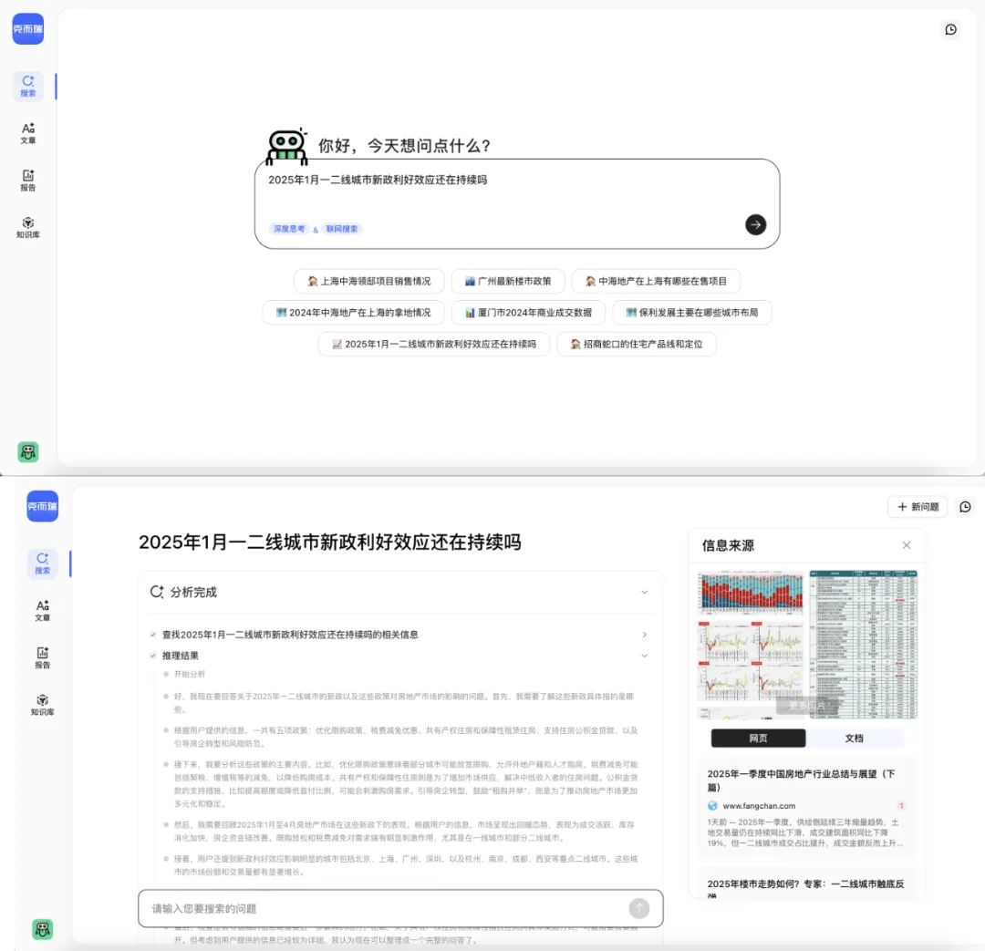 克而瑞AI Agent能够根据用户提问,以地产思维模式进行深度思考,定位所需资料,并通过行业专有参数和克而瑞自有RAG验证资料准确性,通过归纳要点、生成图表等方式呈现,用户也可同步链接参考原文资料。